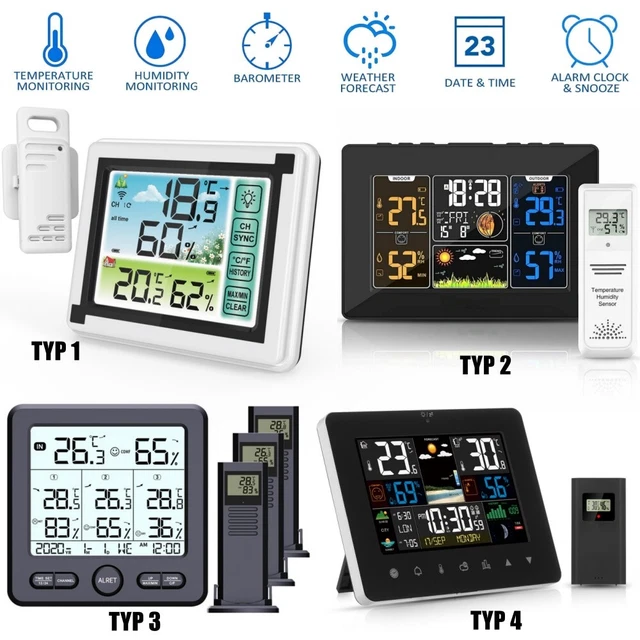 Unterstützt bis zu 3 externe Sensoren mit einer Reichweite von bis zu 100 Metern. Neben Temperatur und Luftfeuchtigkeit zeigt die Station Wettervorhersage (sonnig, bewölkt, Regen, Schnee), Luftdruck, Mondphase, Kalender, Uhrzeit und Wecker an. Temperaturtrend-Funktion und Speicher für Min/Max-Werte.