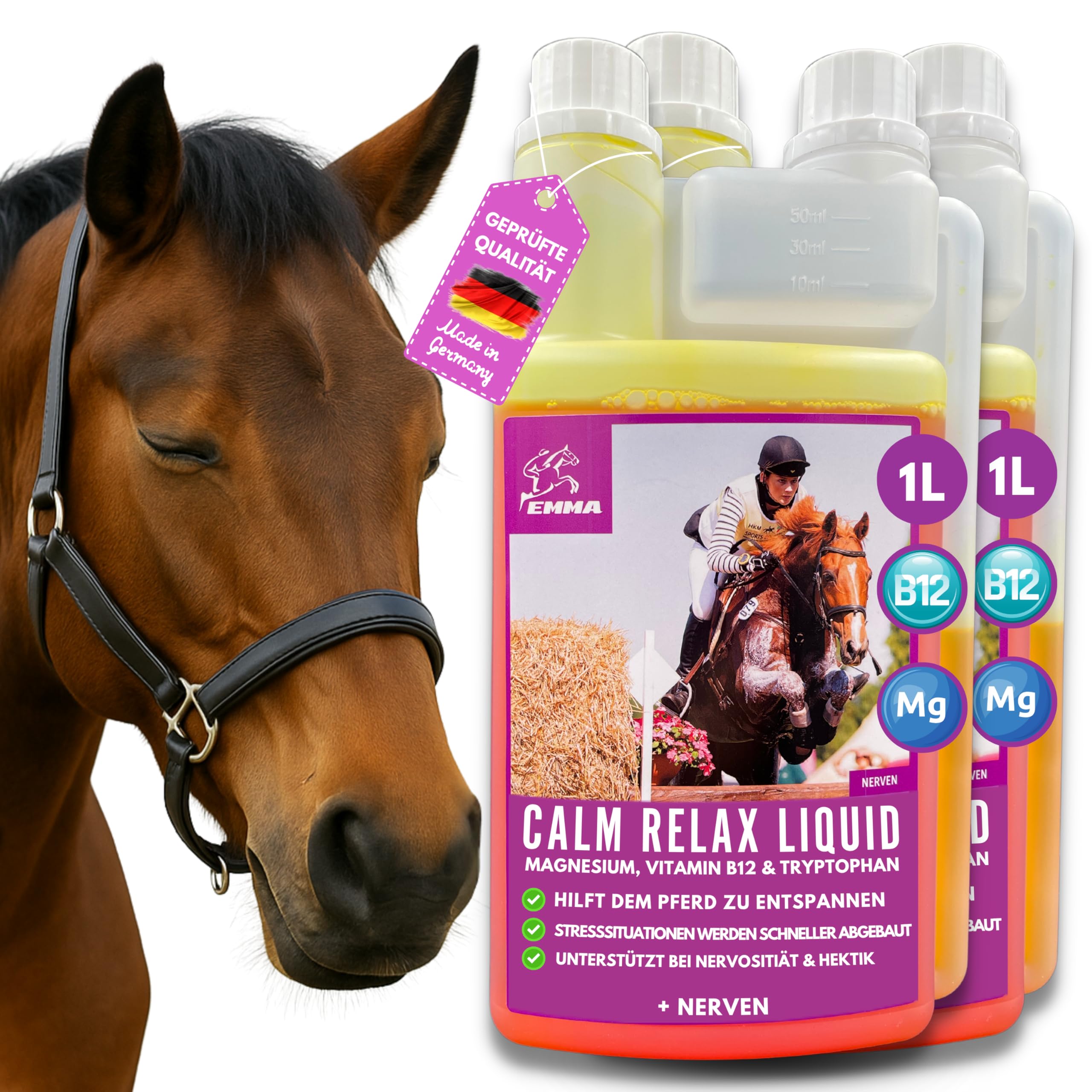 Dein Pferd ist nervös beim Transport, beim Hufschmied oder an Silvester? Die EMMA Calm Magnesium Paste kann helfen! Die Paste enthält hochdosiertes Magnesium sowie L-Tryptophan und B-Vitamine, die unterstützend bei Stress, Angst und Unruhe wirken können. Im Gegensatz zu manchen Beruhigungsmitteln auf Baldrianbasis macht diese Paste nicht schläfrig, sondern fördert die Gelassenheit und Nervenstärke. Einfach die Paste direkt ins Maul geben oder unters Futter mischen – schon kann die beruhigende Wirkung einsetzen. Die Packung enthält 6 praktische Portionsbeutel à 30 ml, ideal für unterwegs oder als Kur. Hergestellt in Deutschland aus hochwertigen Rohstoffen, von Tierärzten empfohlen und ohne Tierversuche. Perfekt für sensible Pferde, bei Stallwechsel, Tierarztbesuchen oder generell in stressigen Situationen. So unterstützt du dein Pferd natürlich und schonend.